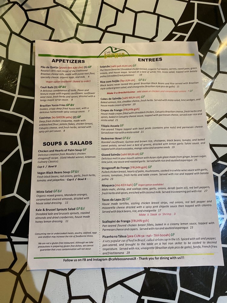 Cafe Bossa Nova is a Brazilian-style cafe located in Little Rock, Arkansas, offering a diverse menu with a focus on fresh and flavorful dishes. The restaurant provides a range of options for diners, including vegan choices and gluten-free meals. Starters like the Po de Queijo and Mandioca Frita showcase traditional Brazilian flavors, while soups and salads like the Mista Salad and Chicken & Hearts of Palm Soup offer lighter options. Main dishes like the Crepes De Frango and Salpicao provide a mix of textures and flavors, creating a satisfying dining experience. Customers rave about the fresh ingredients, friendly service, and authentic Brazilian atmosphere. With a variety of amenities such as outdoor seating and a full bar, Cafe Bossa Nova is a must-visit for those looking to explore Brazilian cuisine in a welcoming setting.